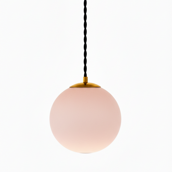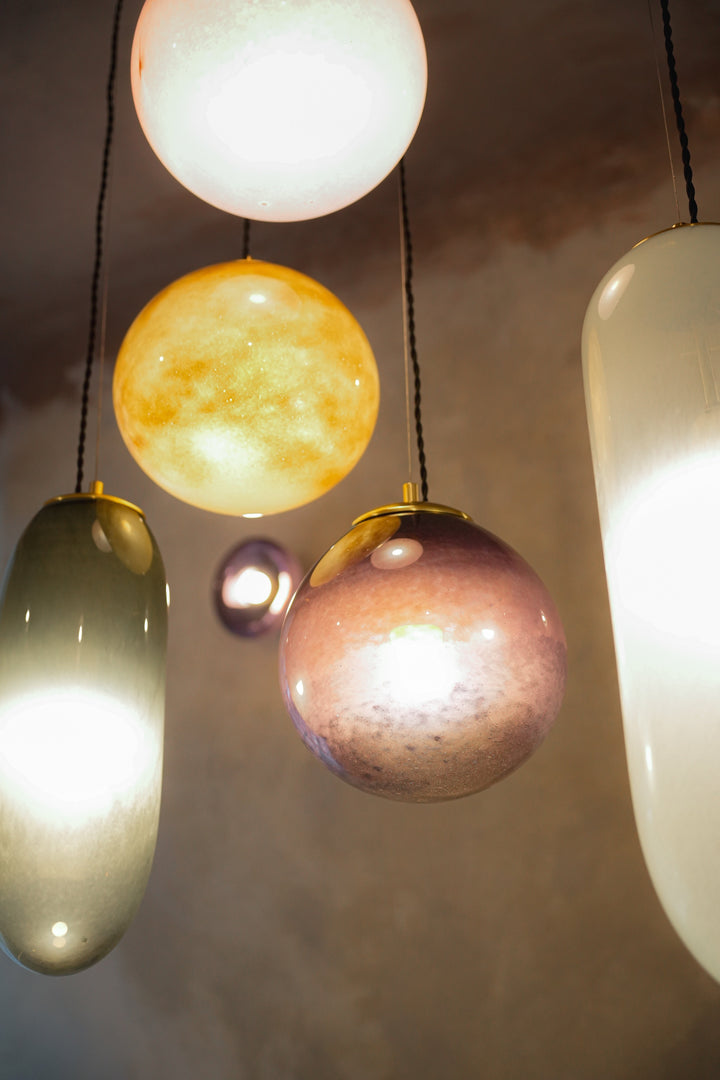 The spherical lampshade, hand-blown by glassmakers, retains a soft cloudy texture inside, reminiscent of moonlight scattered by fog. The warm amber-golden hue creates a feeling of comfort and natural glow, even when the light is off.
